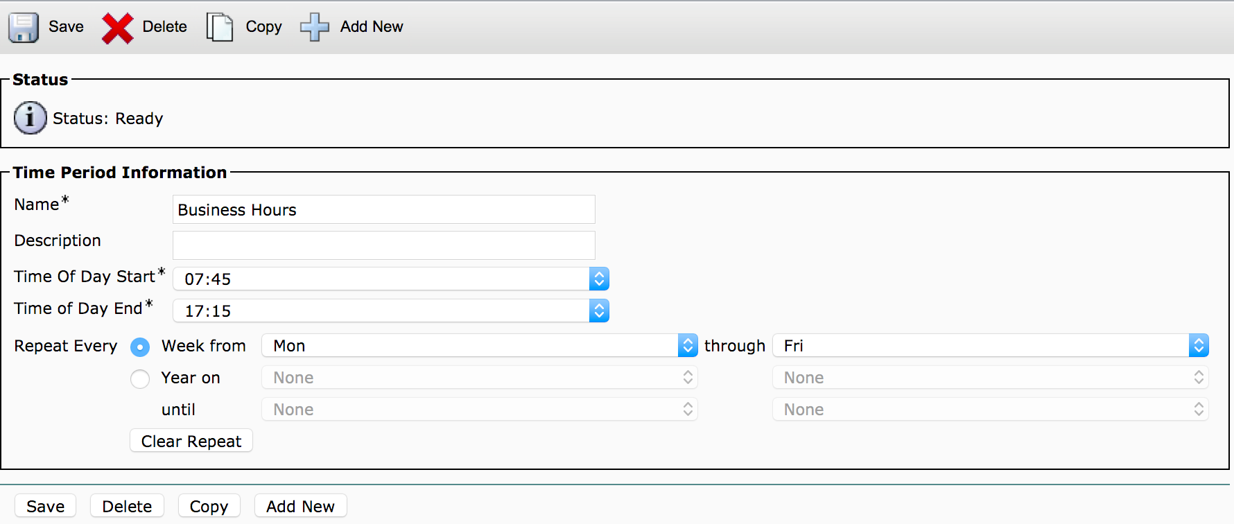 Time of day routing is pretty simple, but can be tedious when a large number of CSSs need to be modified. I wish Cisco would allow CSSs to be nested, which could help solve this problem. For instance, a CSS called “Time of Day Routes” could be created, added to all the CSSs that need to be able to call internal numbers with Time of Day control, then the partitions only need to be added to the Time of Day Routes CSS.
